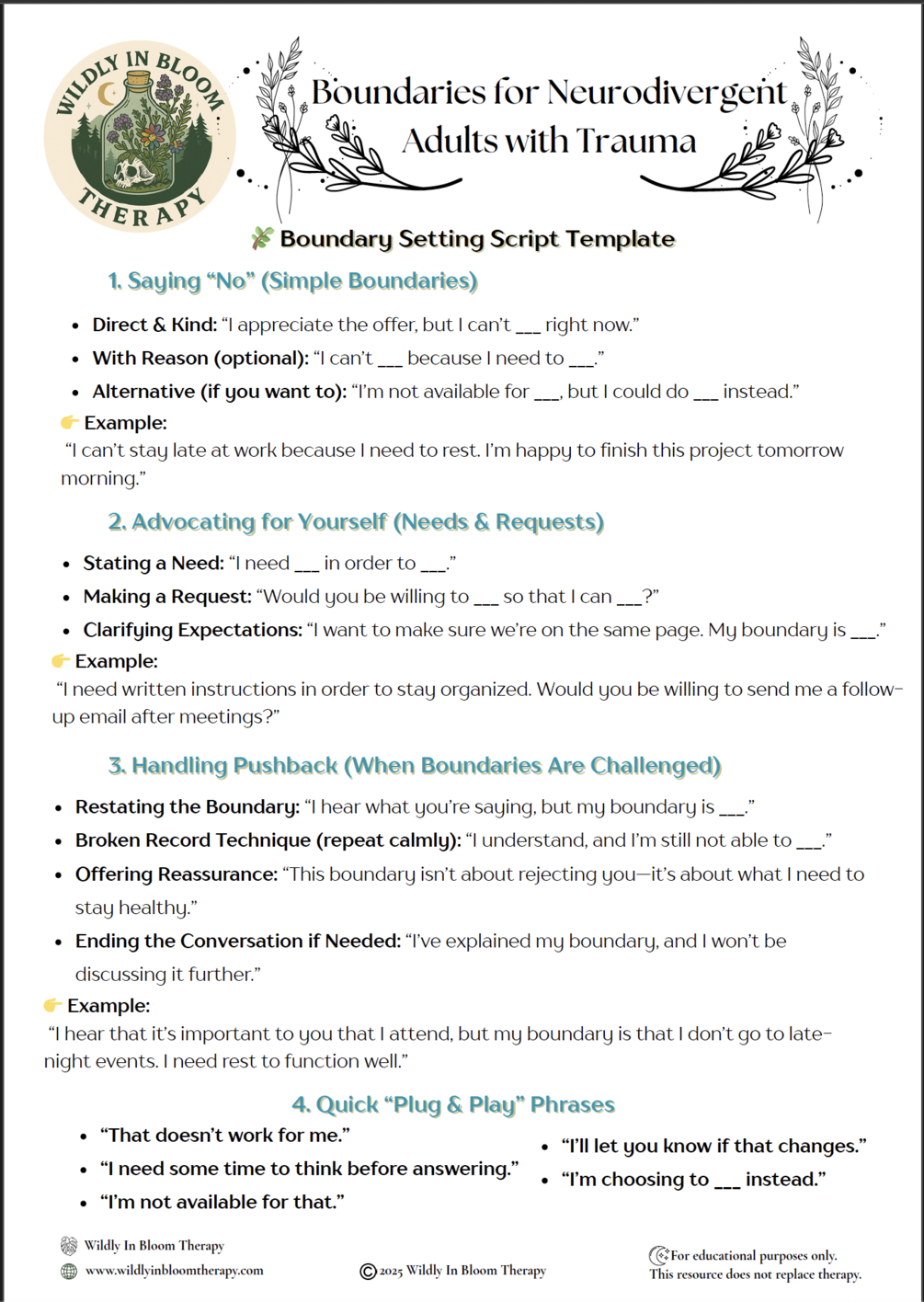 - Boundary Setting Script Template – Fill-in-the-blank scripts for saying no, advocating for yourself, and handling pushback.