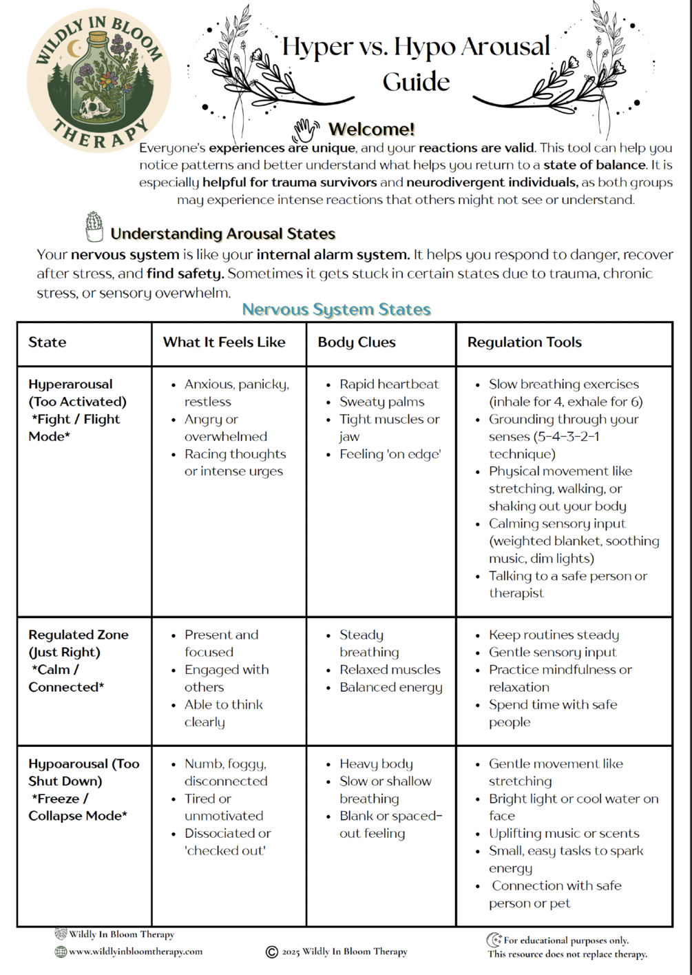 - Hyper vs. Hypo Arousal Guide – A quick-reference chart for nervous system states and coping tools.